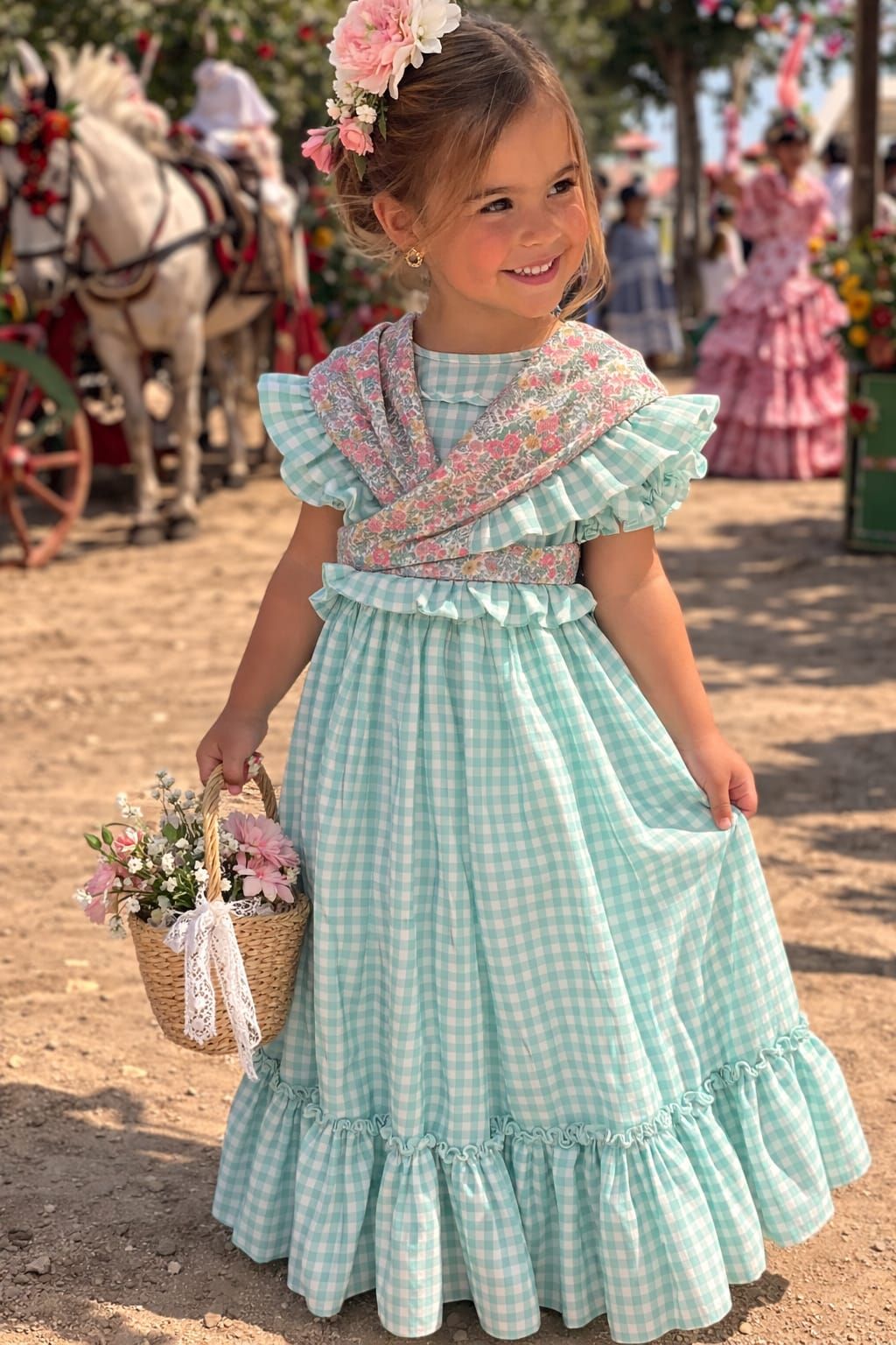 Bata flamenca color vichy verde con mantón flores 2 desde hasta 8 años