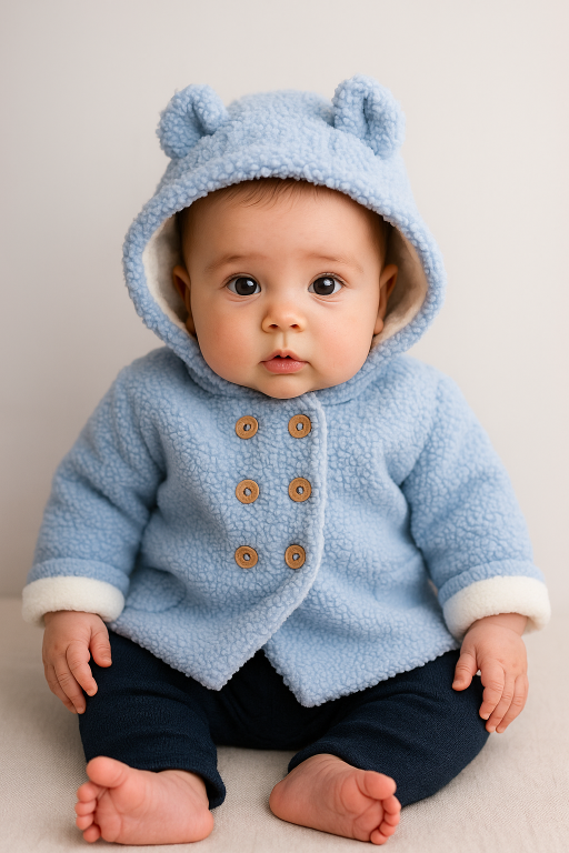 Preciosa chaqueta con gorro en color azul, confeccionada con borreguito muy calentita para los más pequeños.