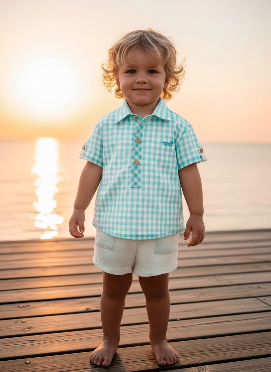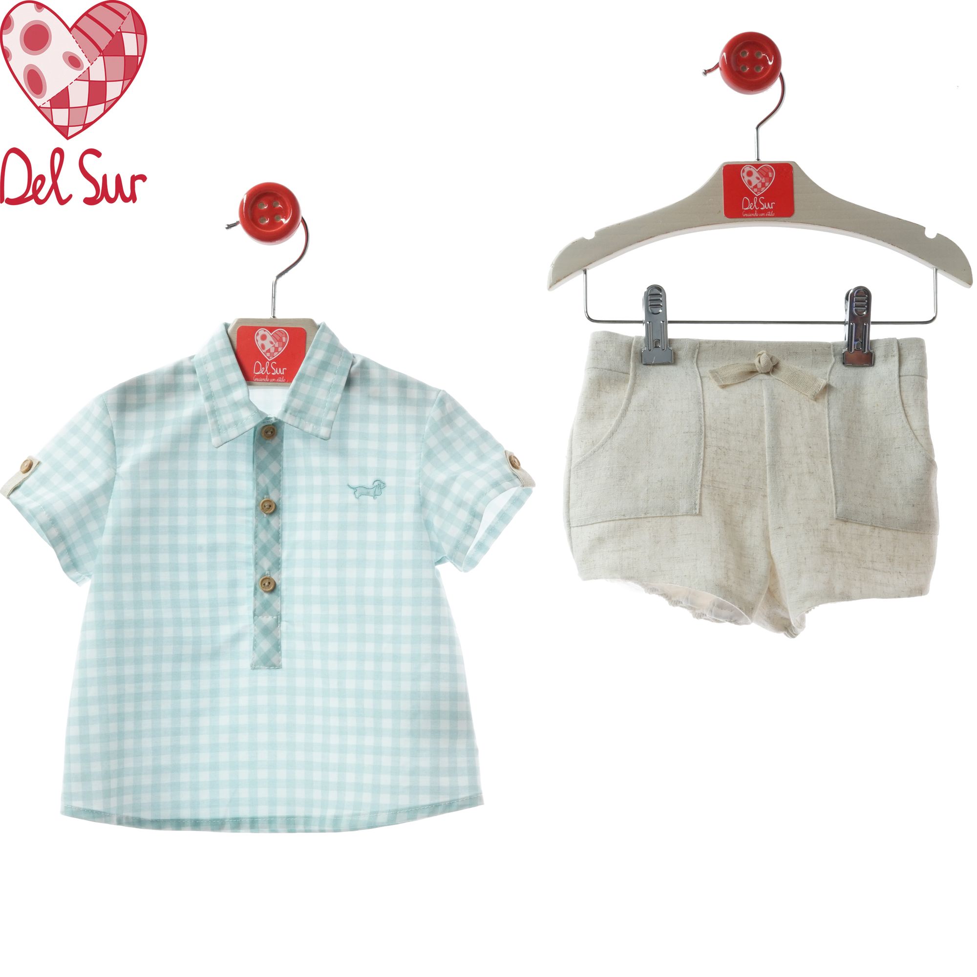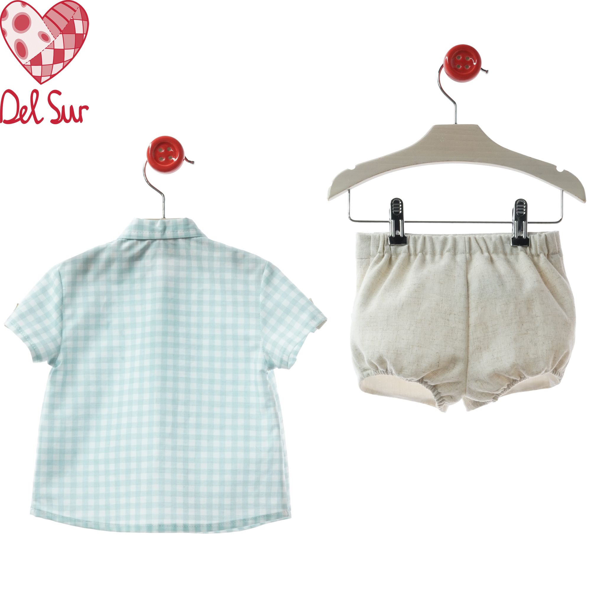 Conjunto camisa corta cuadros turquesa y pantalón corto beig familia Módena ver0276 desde 12 m hasta 48 meses