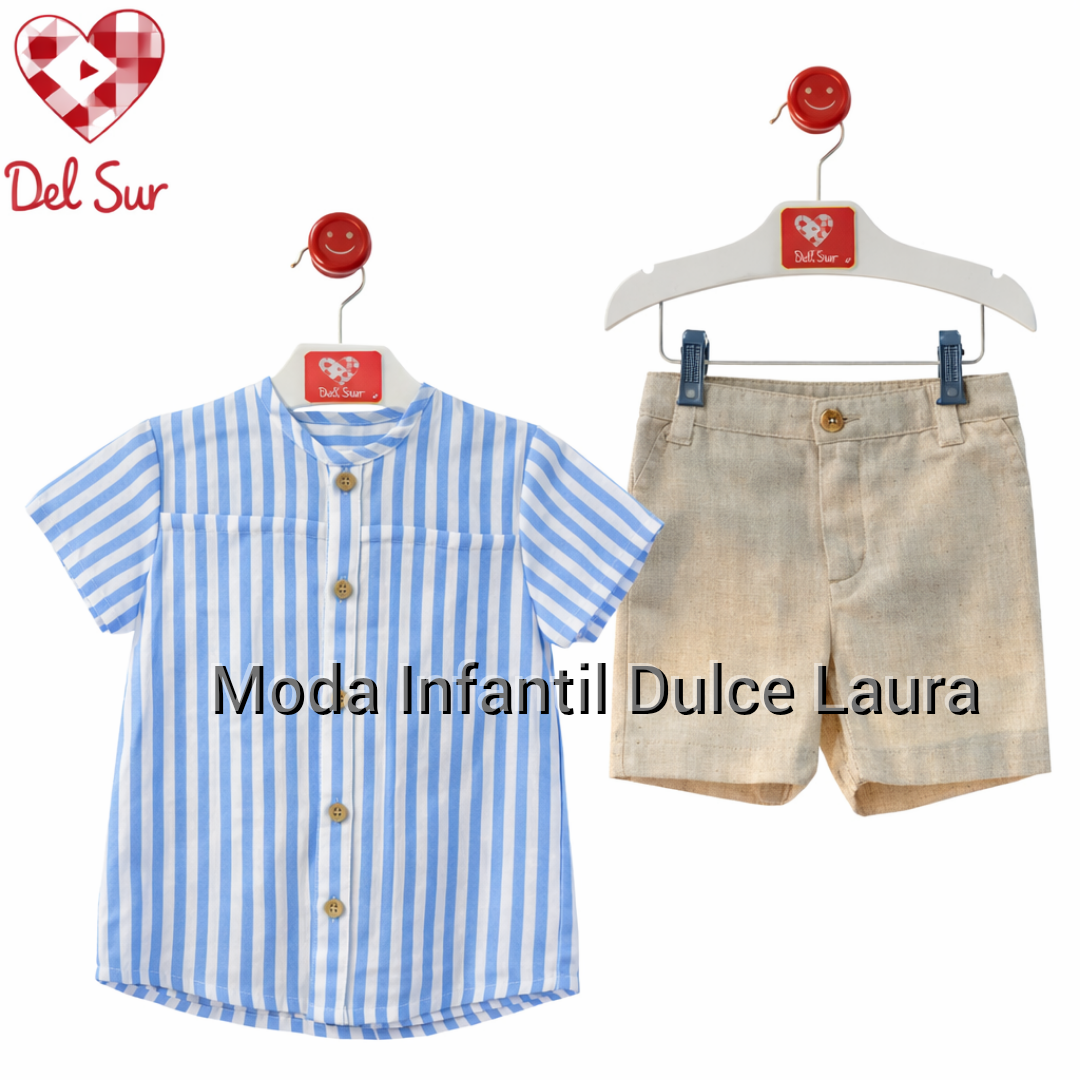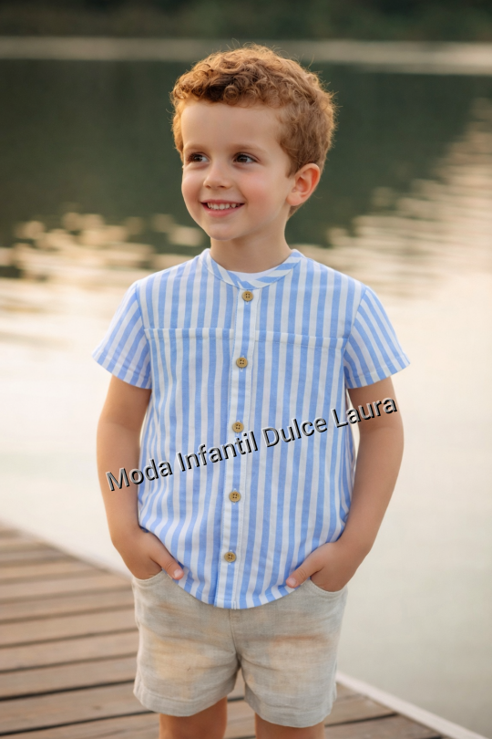 Precioso conjunto de camisa de rayas azules con pantalón corto en lino.