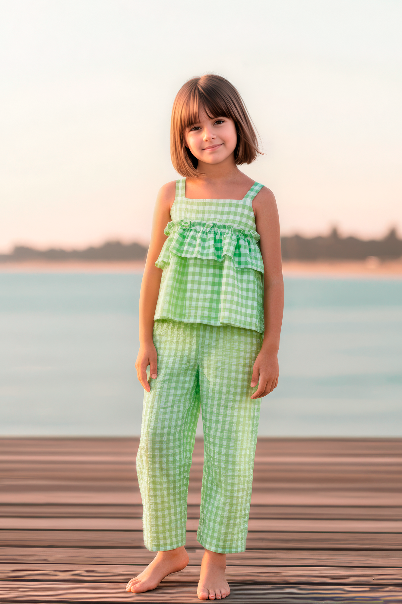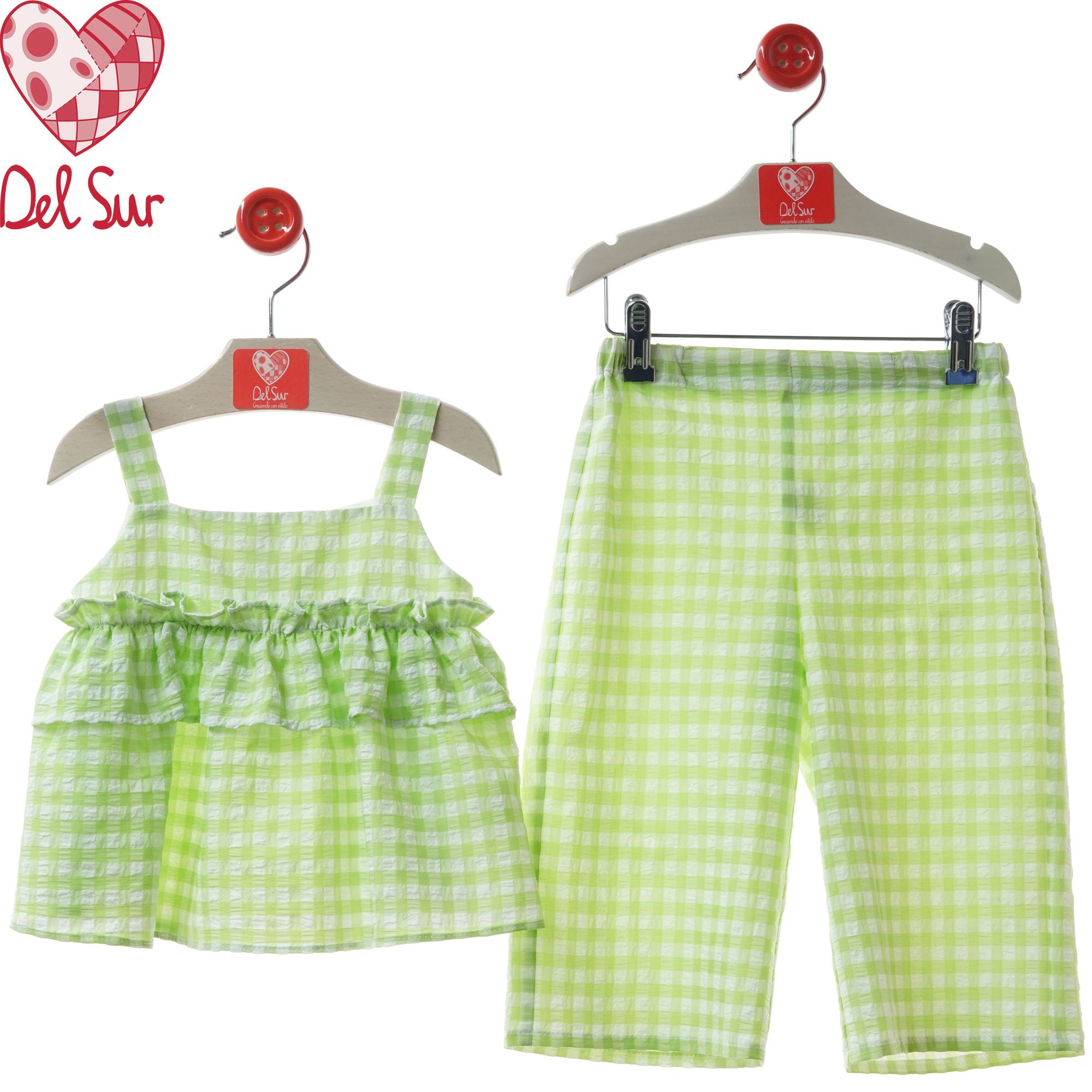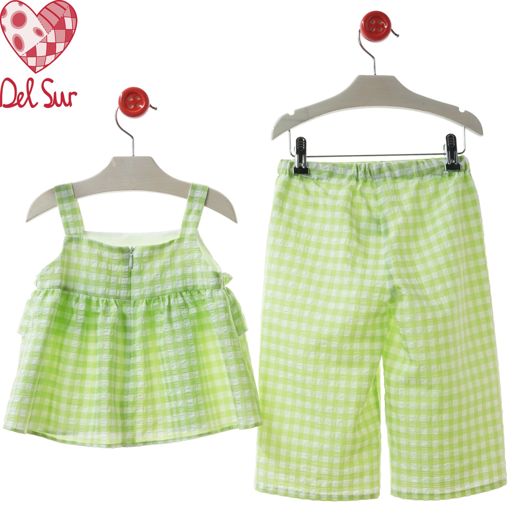 Precioso conjunto camisa pantalón largo color lima cuadros.