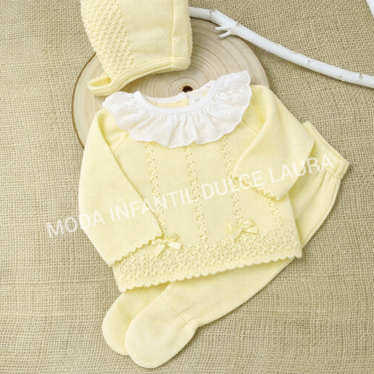 Conjunto hilo 3 piezas jersey, polaina y capota amarillo desde 00 hasta 6 meses C1015