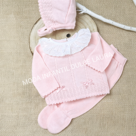 Conjunto hilo 3 piezas jersey, polaina y capota rosa desde 00 hasta 6 meses C1015