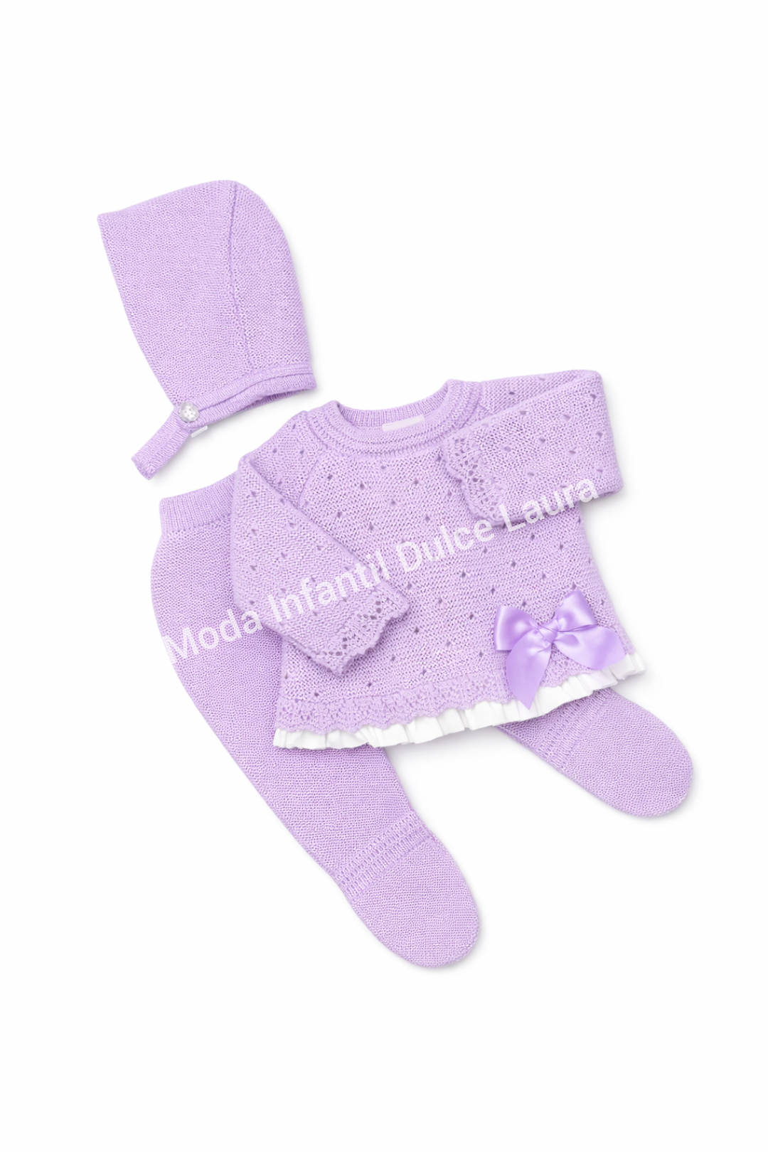 Conjunto hilo 3 piezas lazo morado desde 00 hasta 6 meses C1013