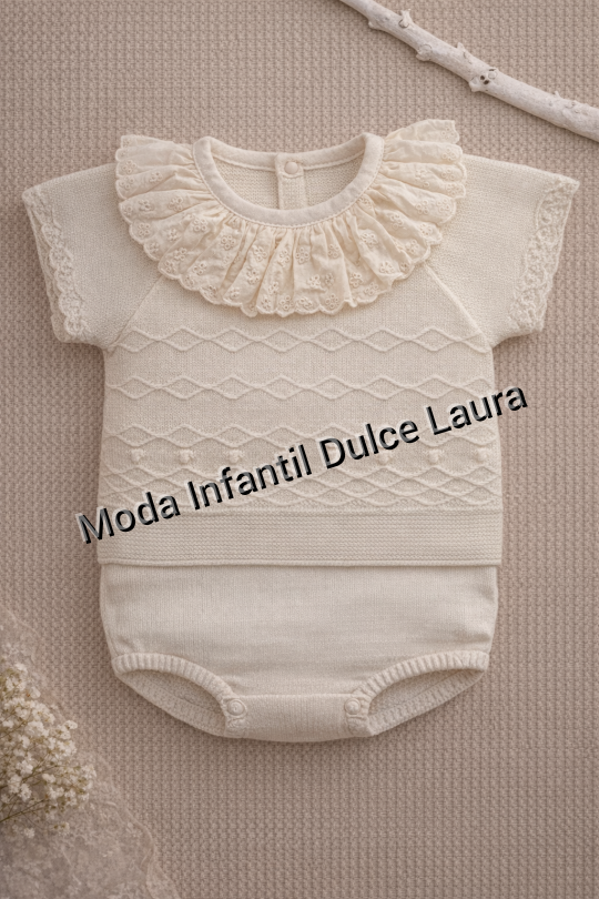 Conjunto hilo jersey cuello redondo y ranita marfil desde 0 hasta 24 meses C1100