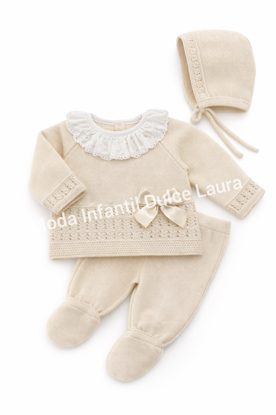 Conjunto hilo tres piezas cuello volante y lazo arena desde 00 hasta 6 meses c1004