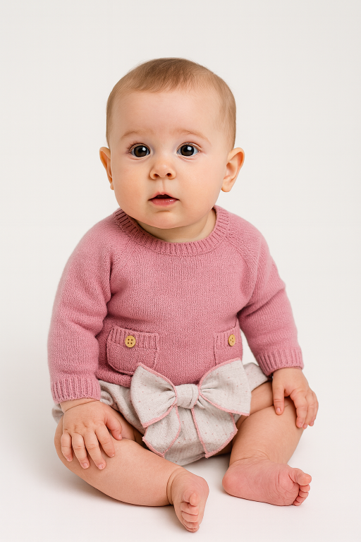 Precioso conjunto de la marca la ormiga compuesto por un jersey en color rosa maquillaje y por una braguita gris con lazo a juego.