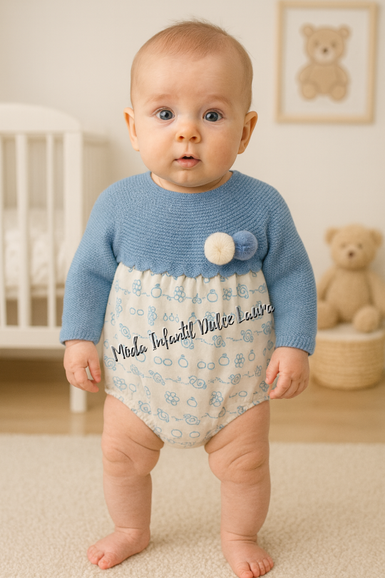 Pelele pompón azul y blanco lana y tela desde 1 mes hasta 18 meses