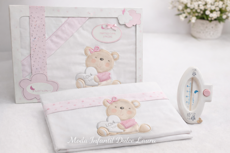 Sabana algodón cuna osito rosa con termómetro bañera