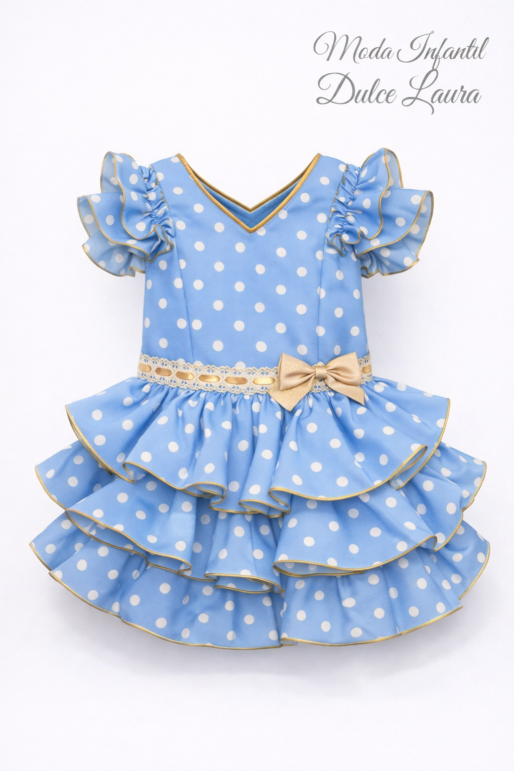 Vestido de flamenca azul lunares blancos detalles en camel desde 2 años hasta 8 años