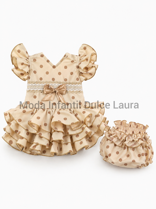 Vestido de flamenca beig lunar y detalles camel con braguita a juego desde 3 meses hasta 18 meses