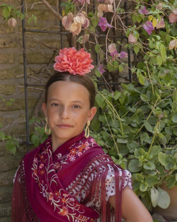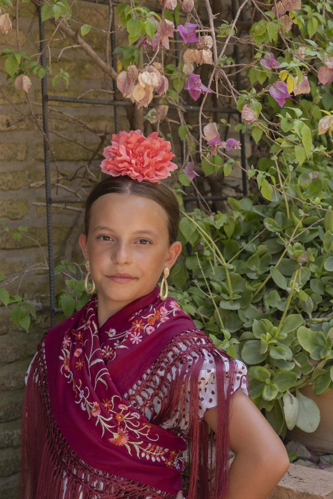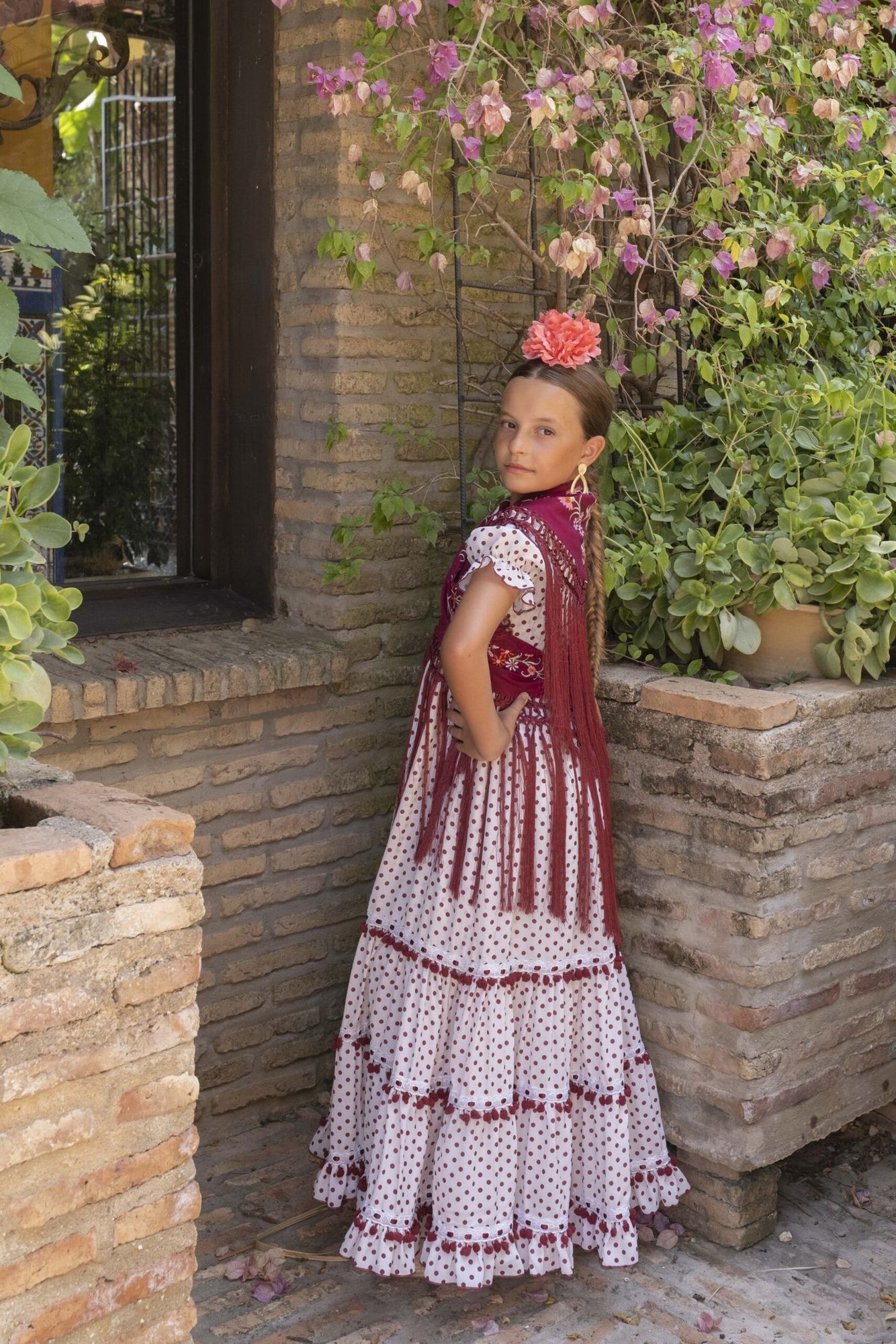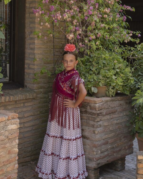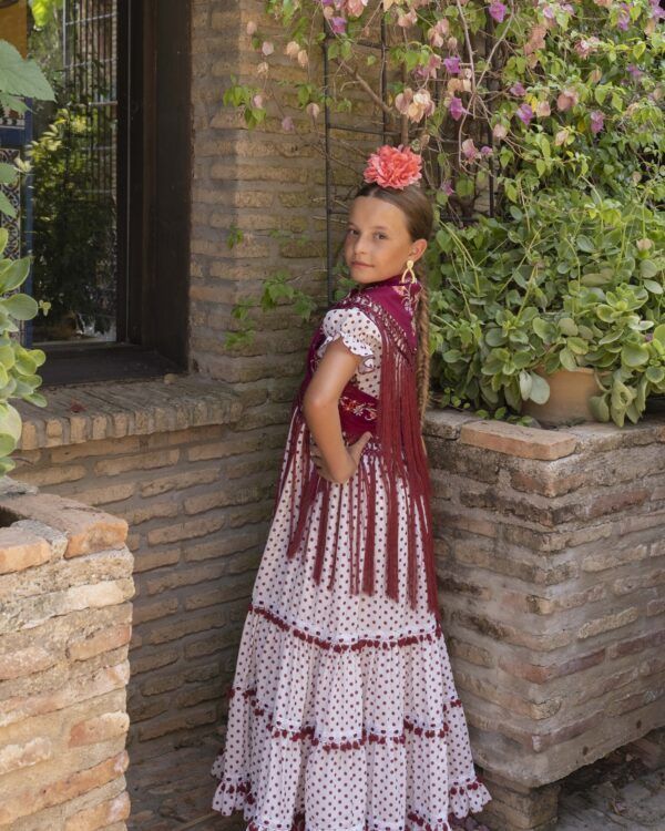 Vestido de flamenca para niña pequeña de color beige con lunares burdeos, de talle alto, manga de farol y bajo de volantes.