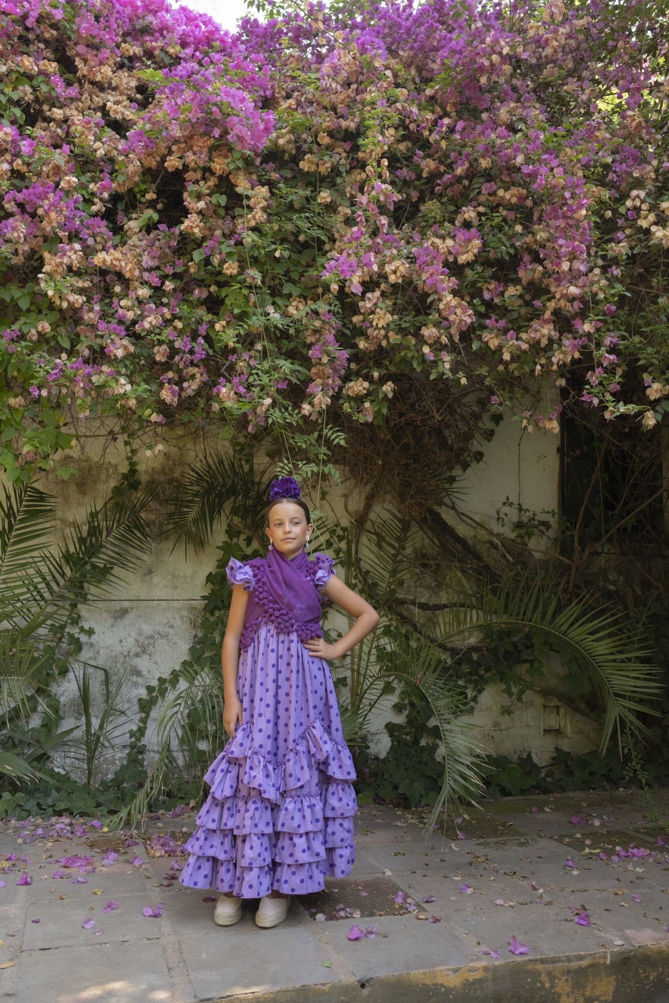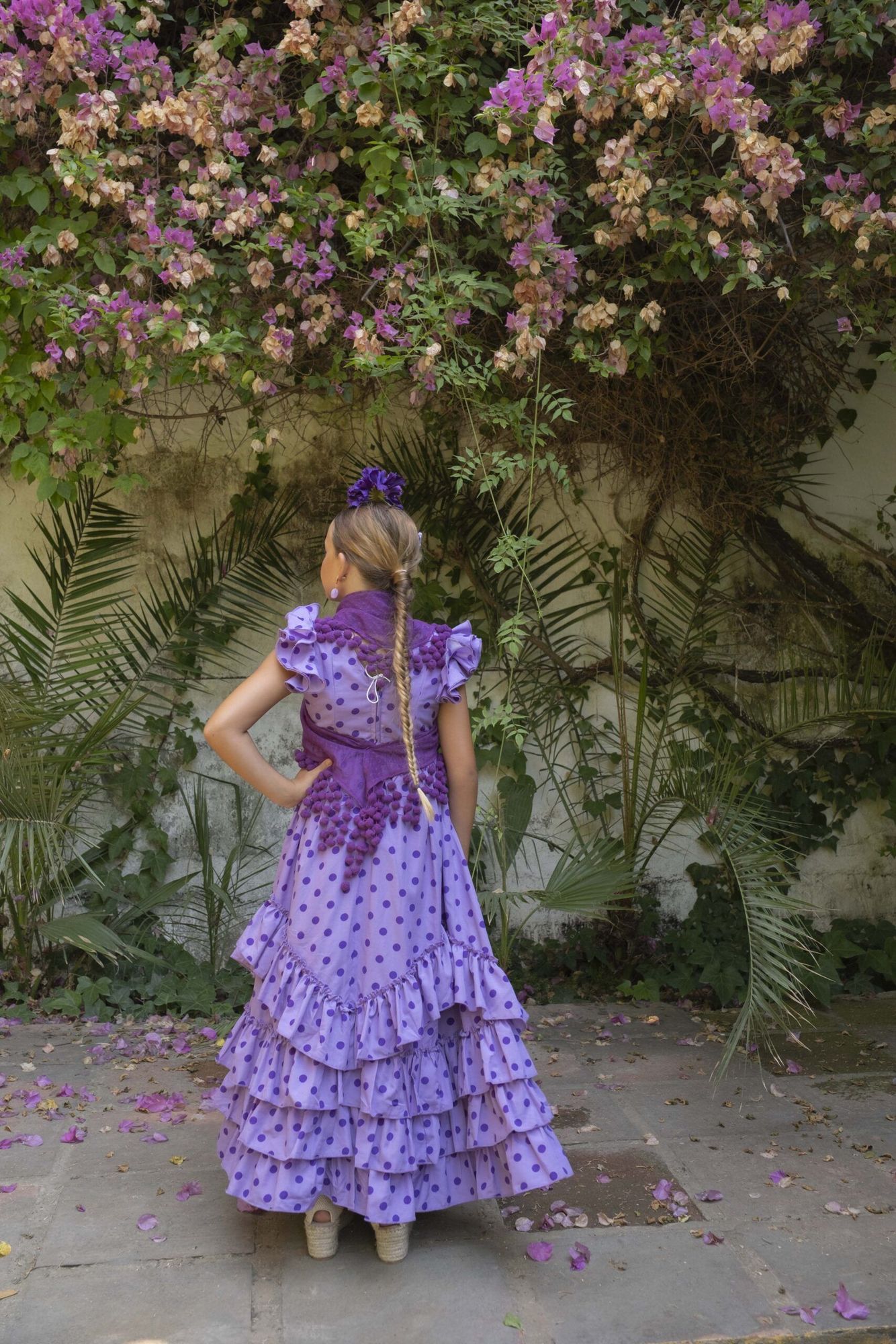 Vestido de flamenca para niña pequeña de color morado con pequeños lunares al tono, de talle alto, manga a la sisa y bajo de volantes. y falda canastera.