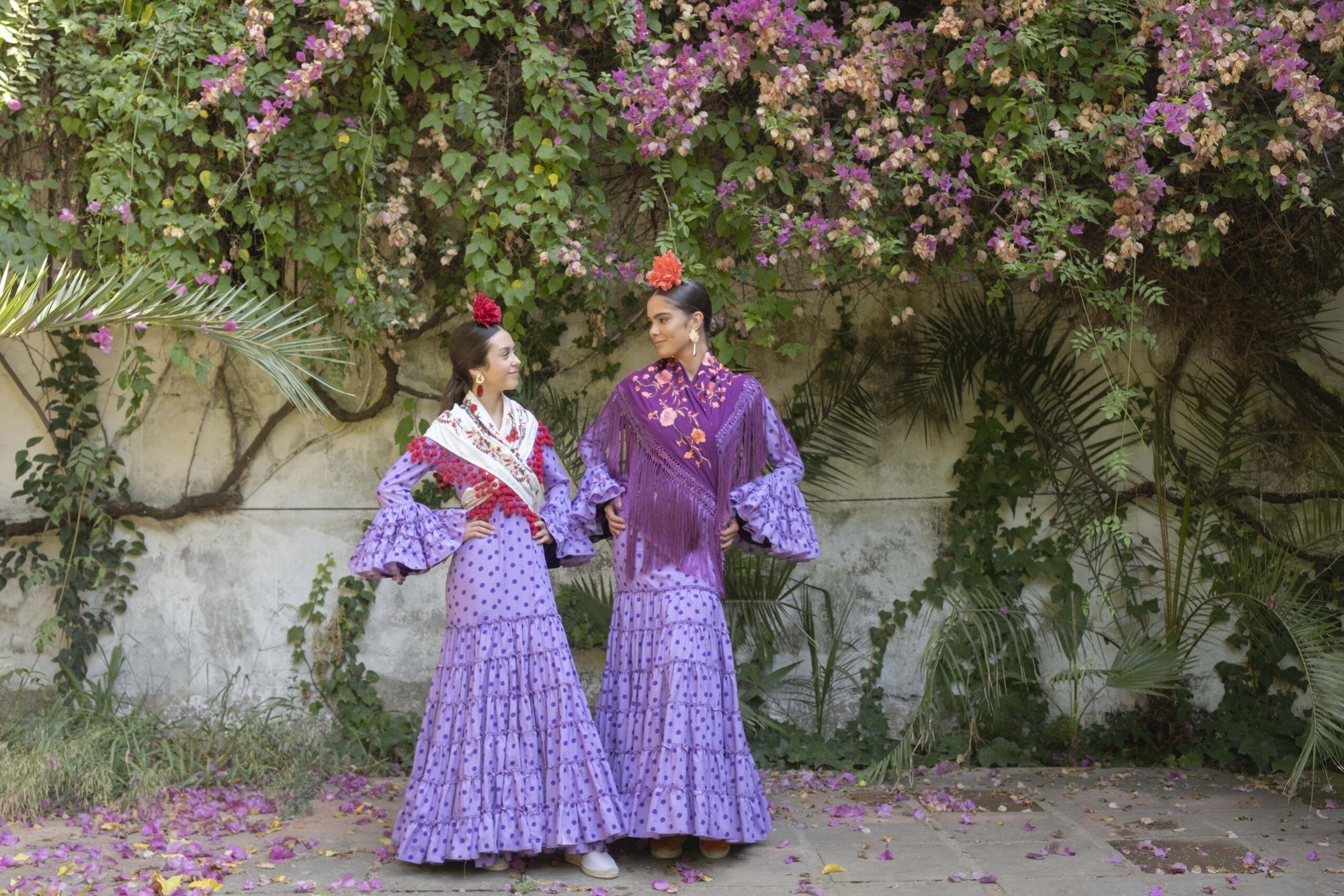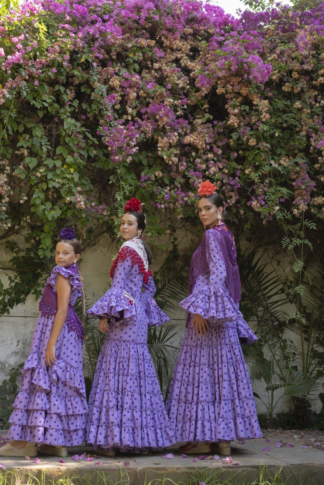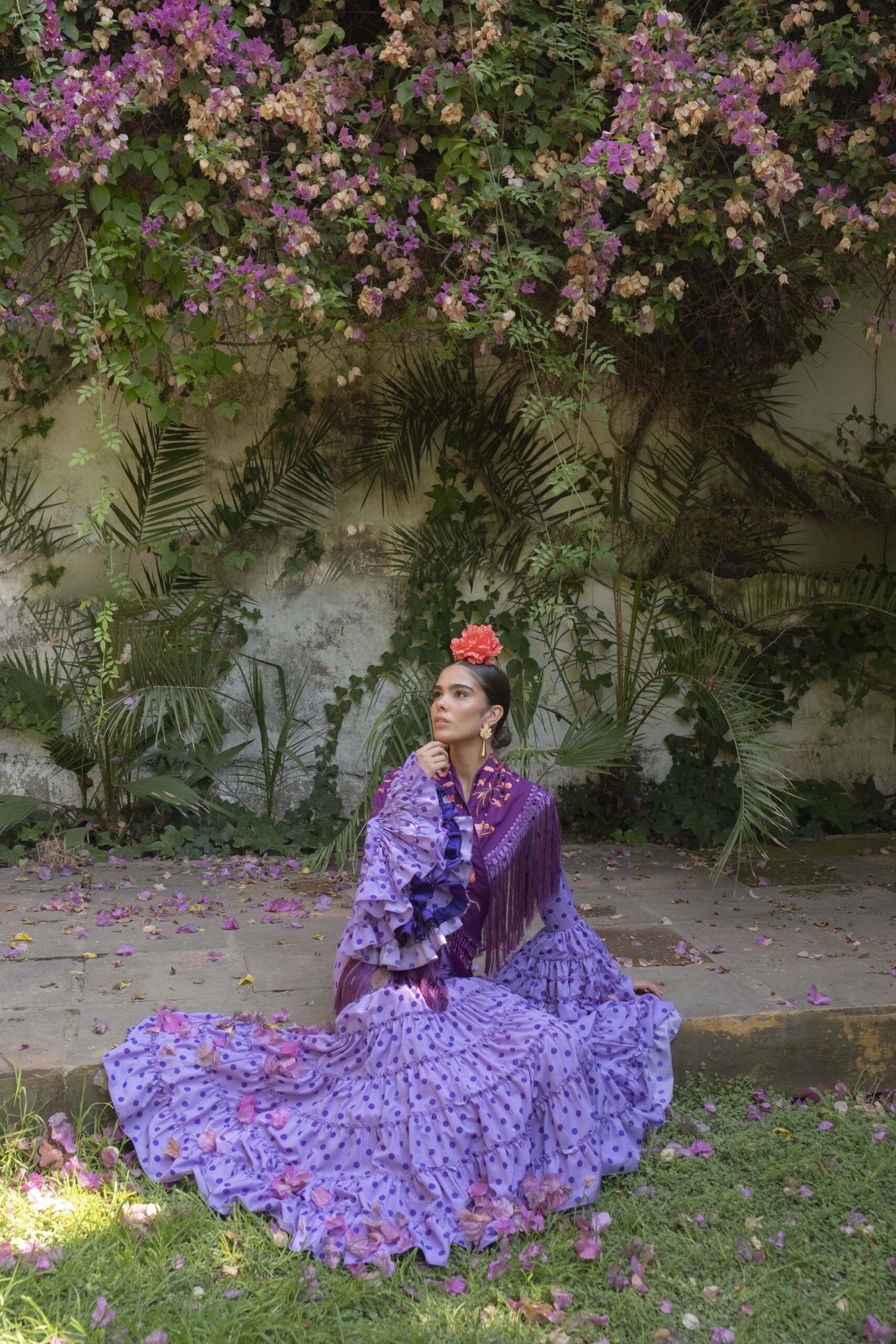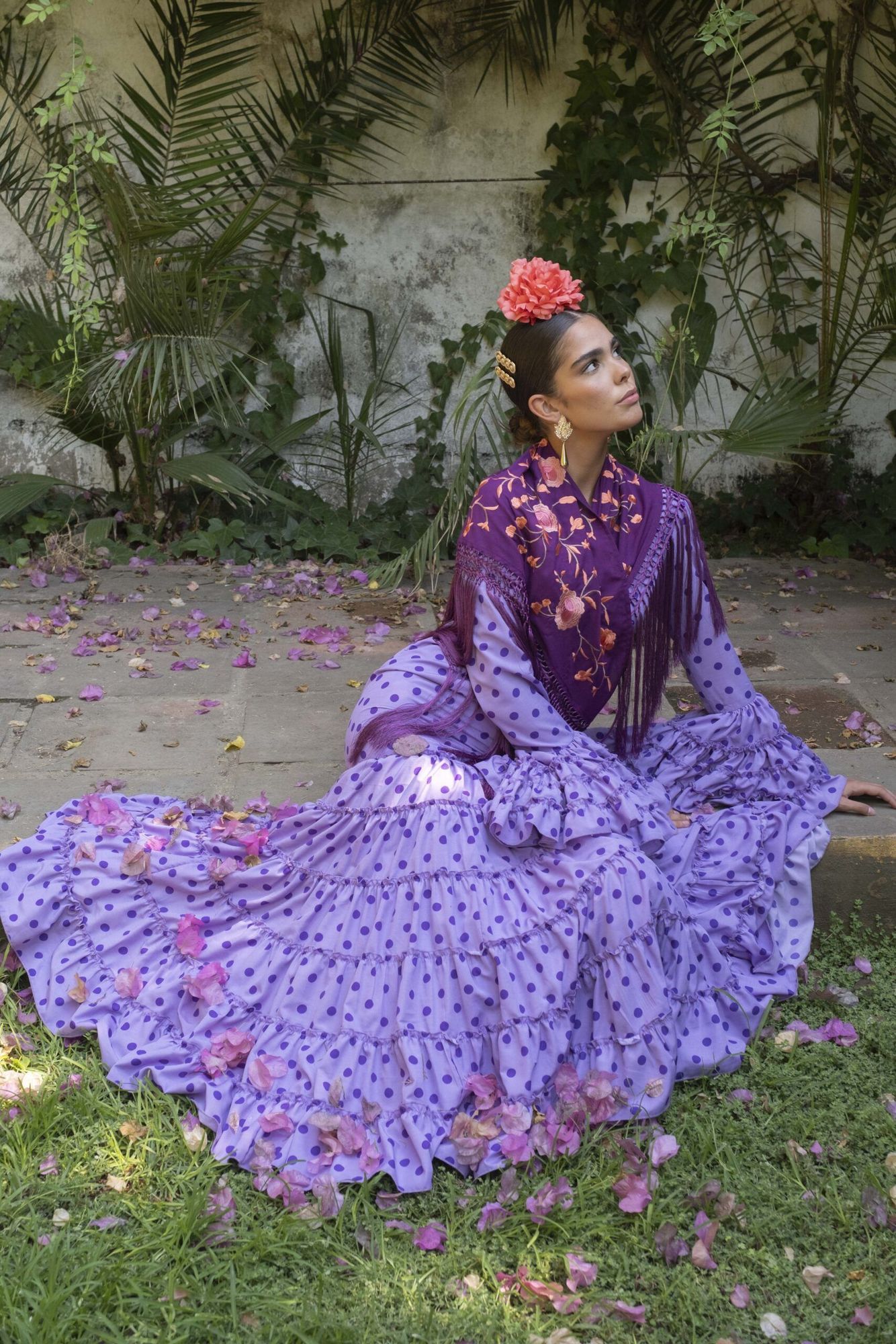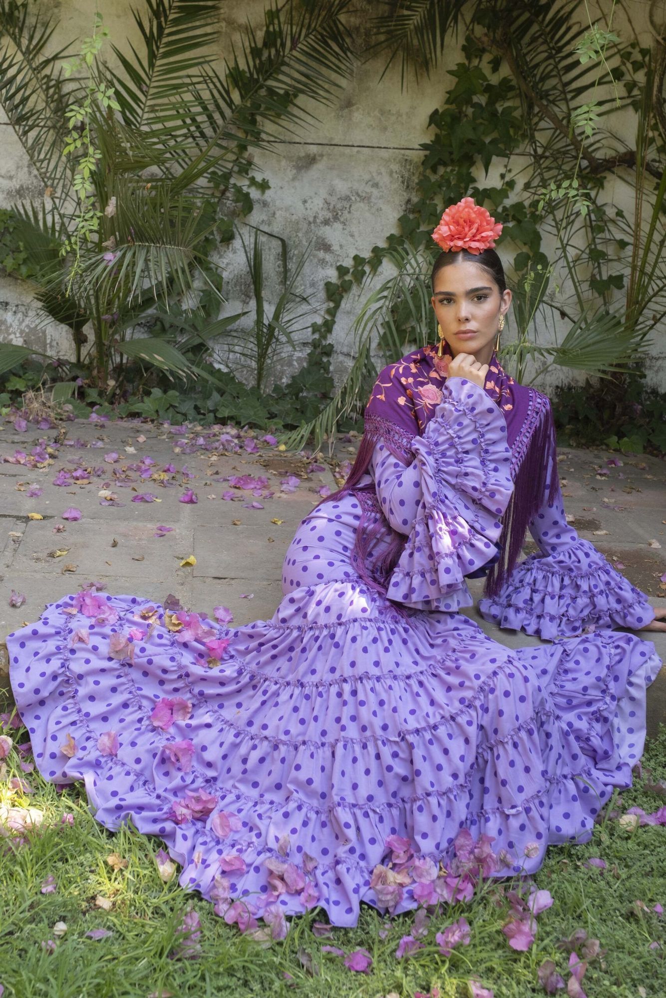 Vestido de flamenca para mujer de color morado con lunares al tono, de manga larga y falda canastera.