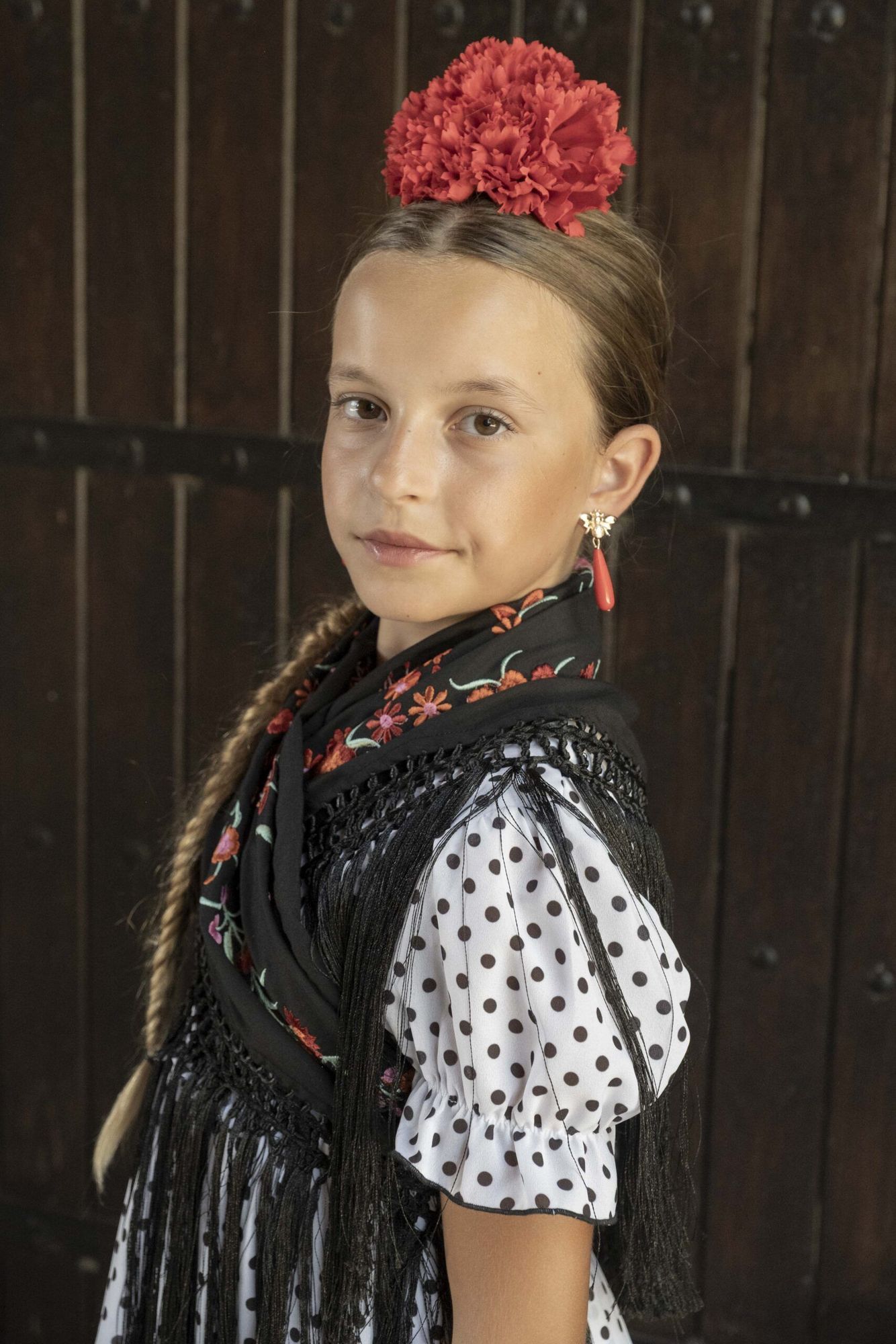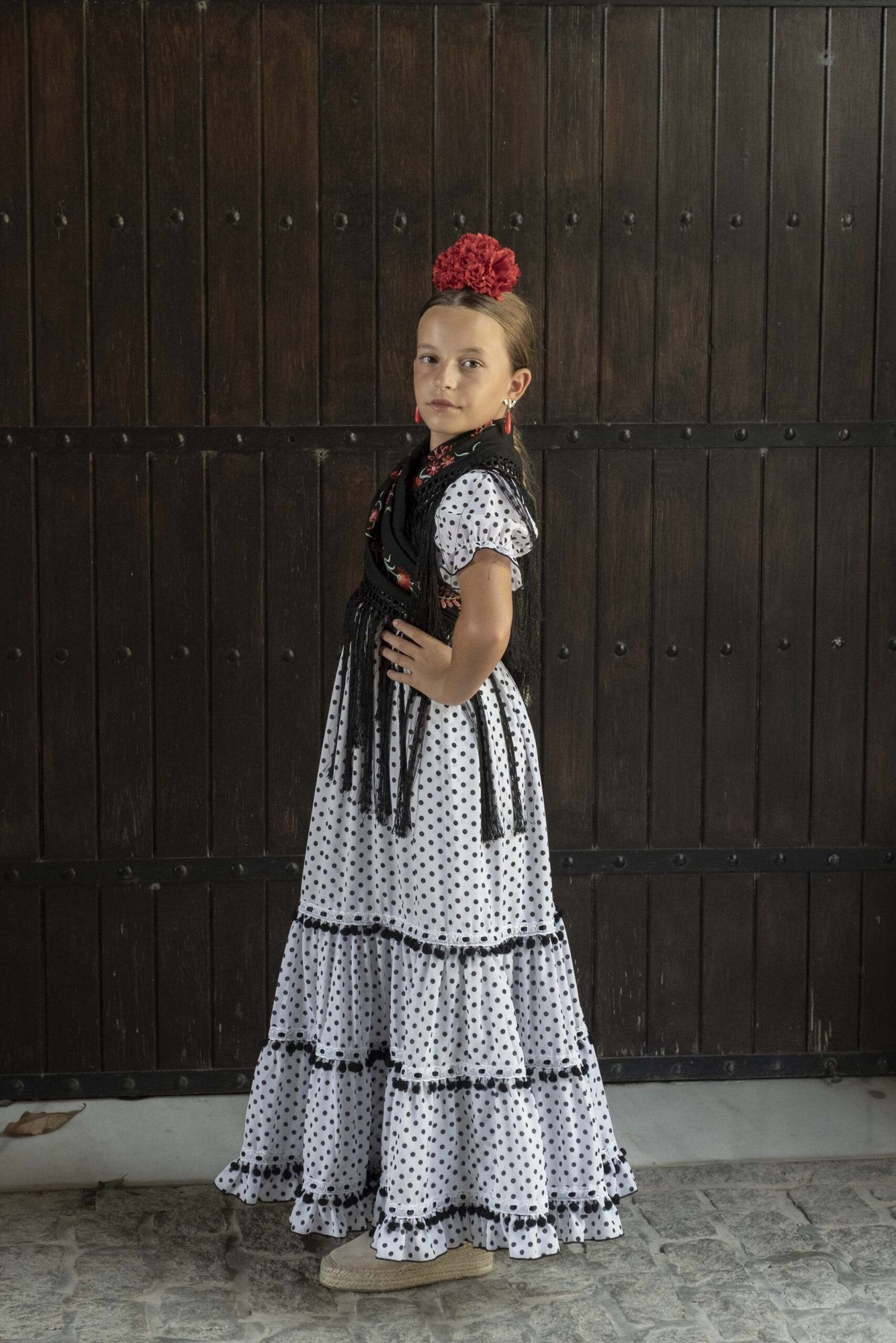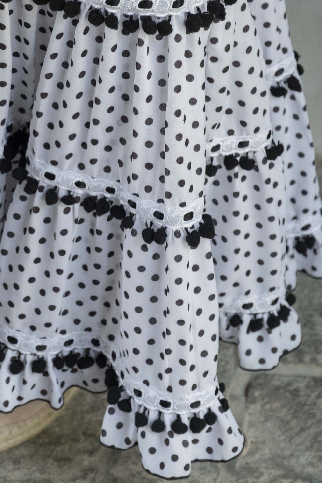 Vestido de flamenca para niña pequeña de color blanco con pequeños lunares negros, de talle alto, manga de farol y bajo de volantes. y falda canastera.