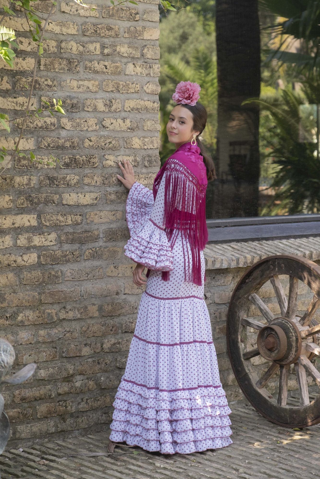 Vestido de flamenca para niña de color blanco con lunares rosa, de manga larga y falda canastera.