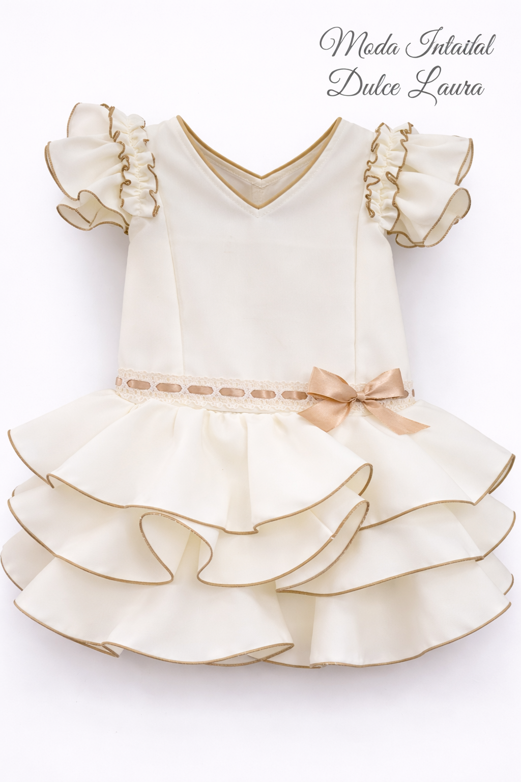 Precioso vestido de flamenca en color beig liso y detalles en color camel.
